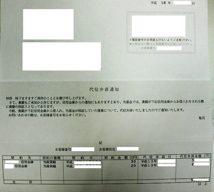 保証基金から、代位弁済通知が普通郵便で届きました。